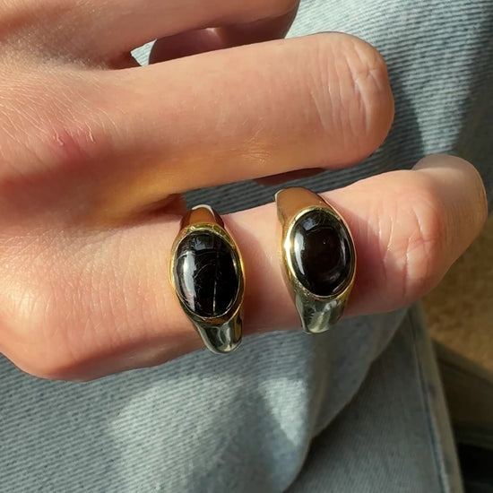 Our signet ring is a unique statement with a smooth gold band and a dark, smoky, oval-shaped hypersthene stone with eye-catching natural inclusions. Made entirely by hand for a truly one-of-a-kind ring.